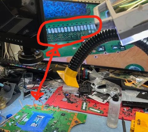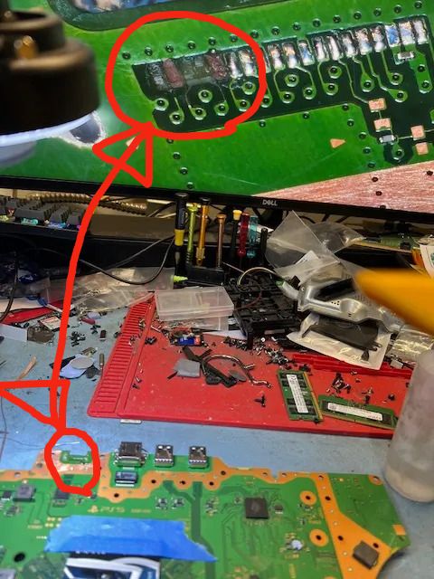 Motherboard trace repair Playstation 5 HDMI traces have been broken/removed. Fix with jumper cable. Broken trace. Trace enlarge. Micro soldering.